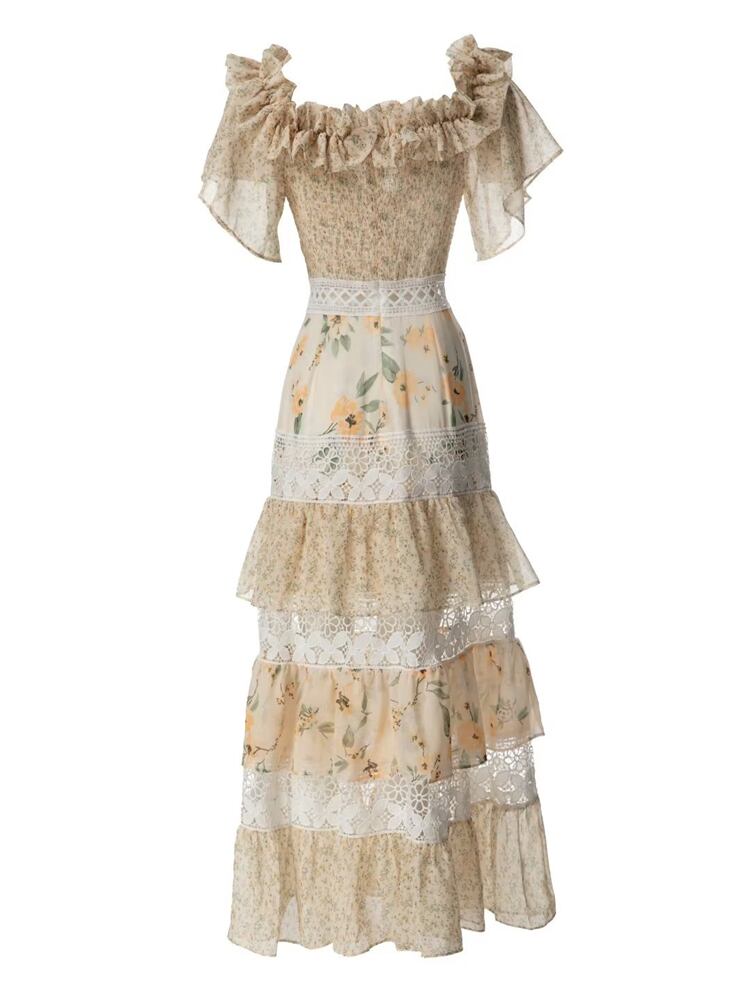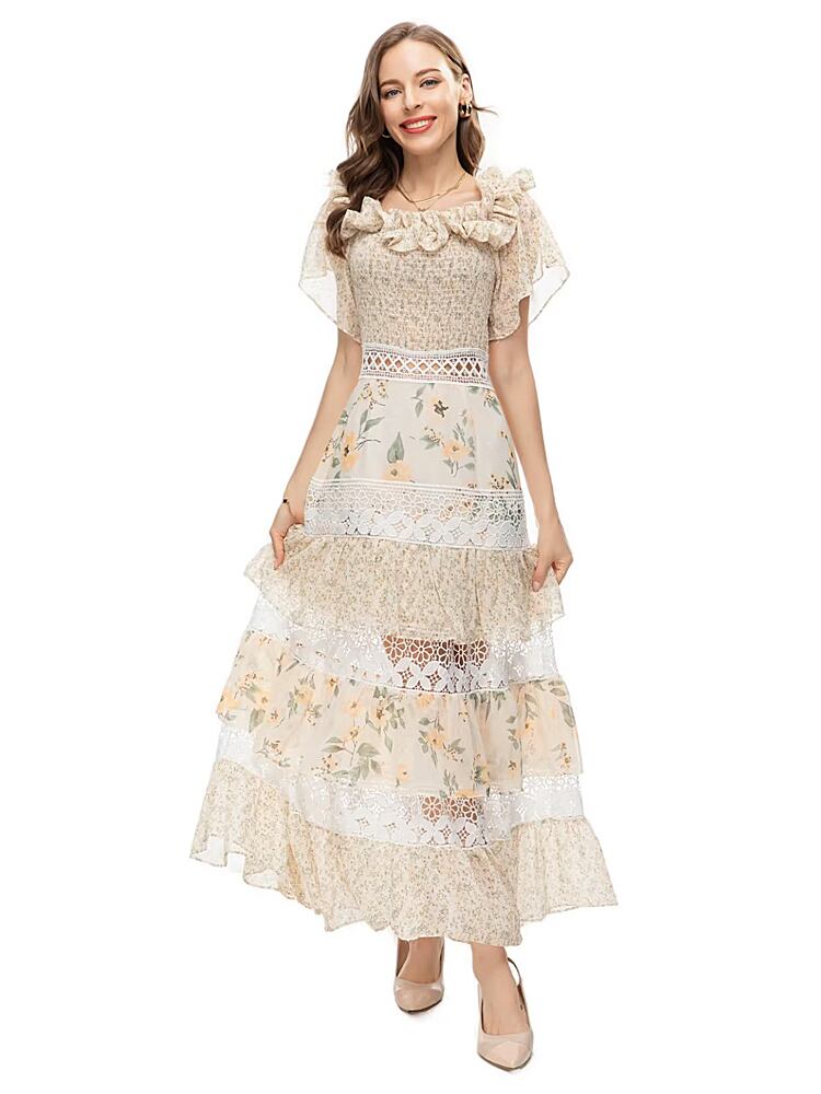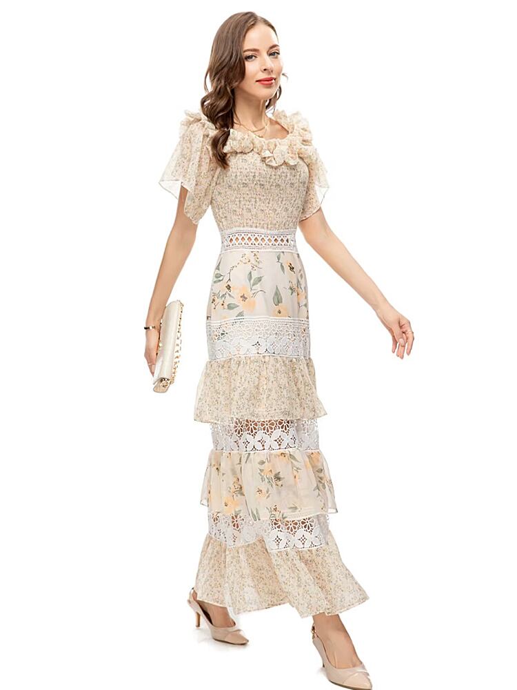 夏プリント中空ケーキ弾性パーティー高級ロングドレス エラスティック 伸縮 サマー 夏物