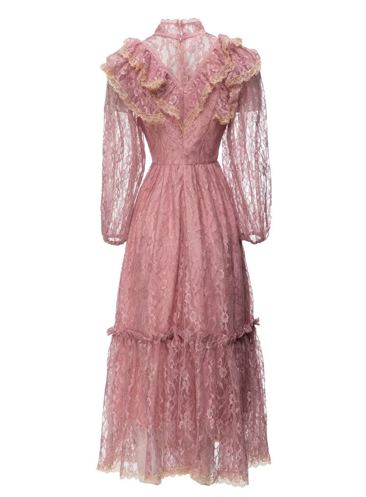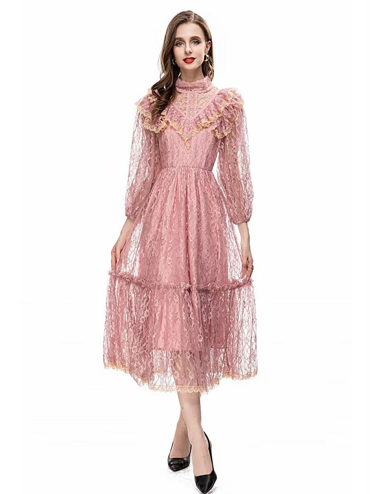 高級春秋ピンクメッシュスリムシックパーティーセレブガールズオフィスミディドレス スプリング 春物 オータム 秋物 会社 学校 通勤や通学にも