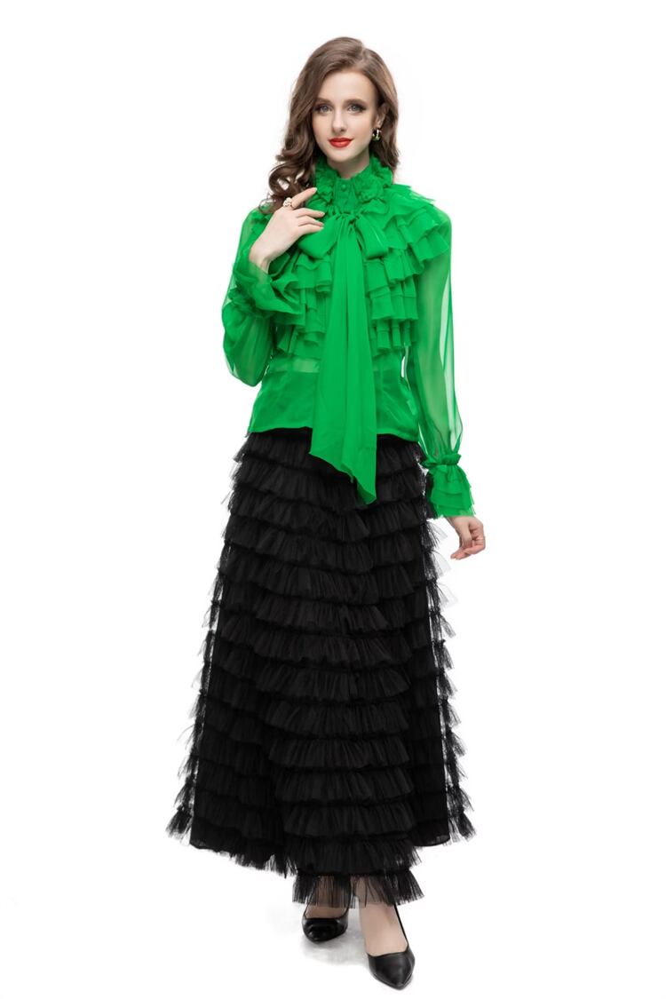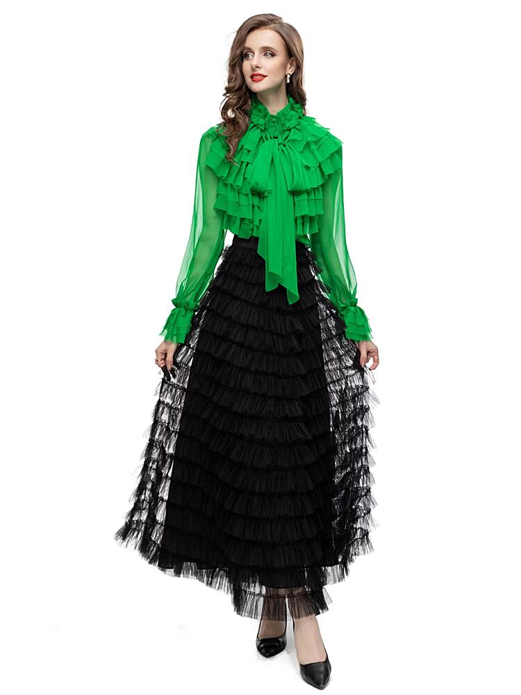 3点セット 春秋パーティー グリーントップ ブラックメッシュ ケーキハーフスカート レディースセット スプリング 春物 オータム 秋物