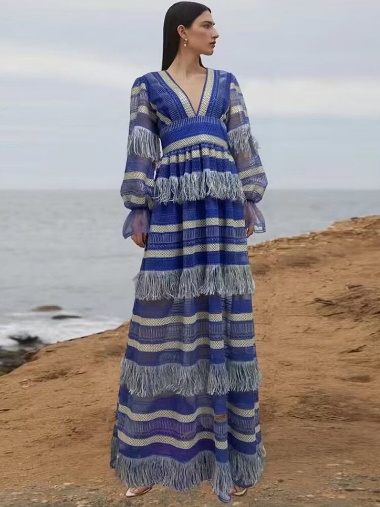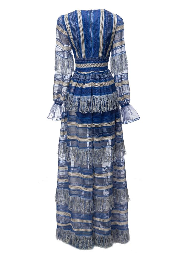 豪華秋パーティーブルーストライプ中空アウトテルセクシー紳士スーパーマキシドレス オータム 秋物