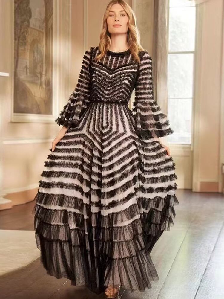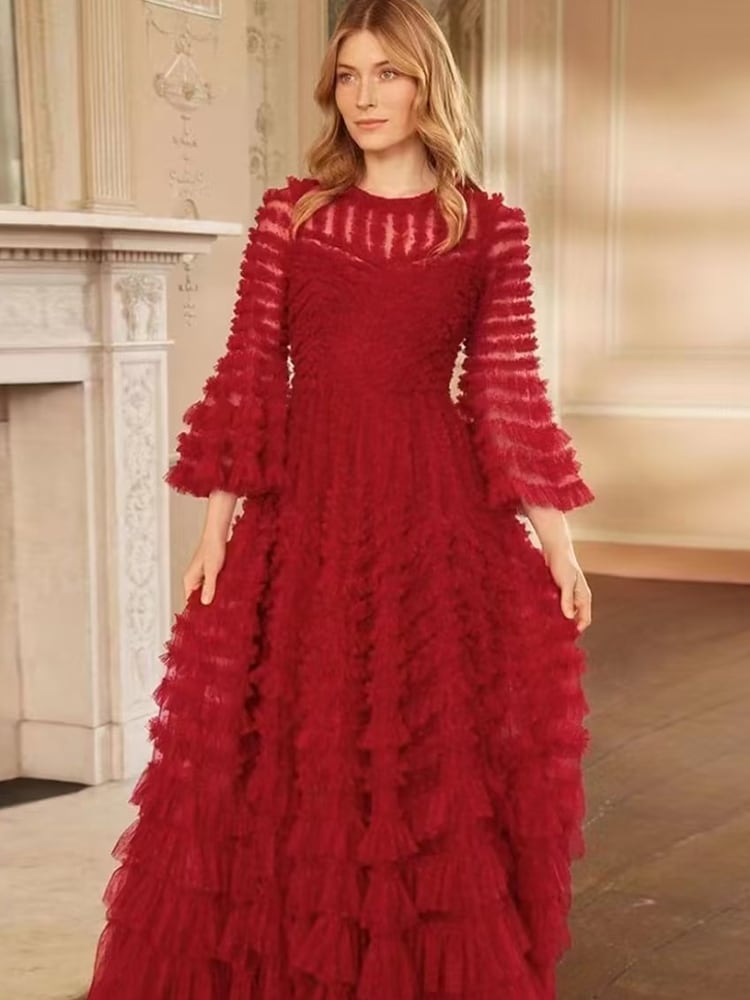 滑走路春秋パーティー高級メッシュパゴダスリーブレッドセクシーセレブロングドレス スプリング 春物 オータム 秋物