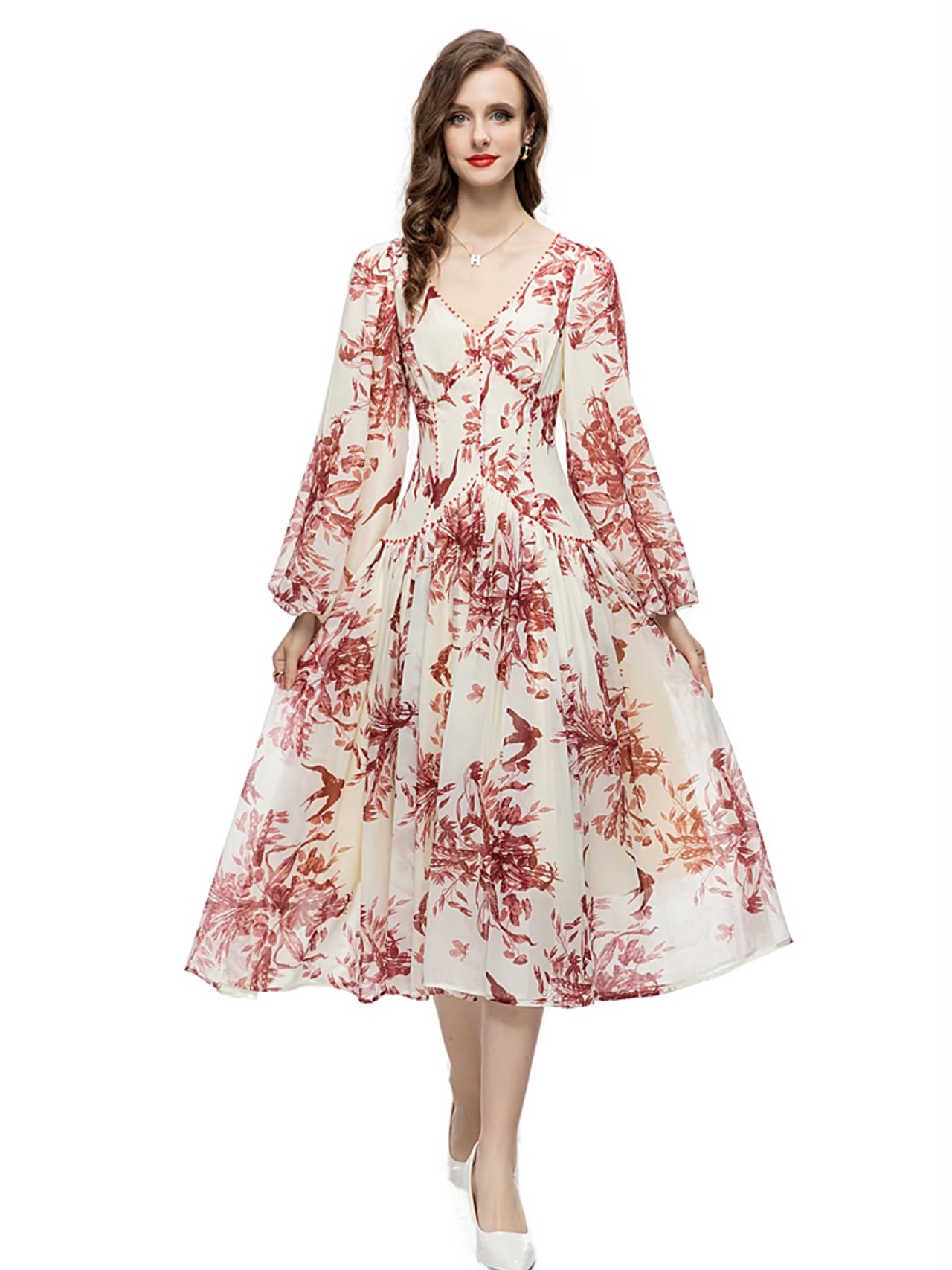 春秋パーティープリントボヘミアンスリムビーチホリデー日焼け止めミディドレス スプリング 春物 オータム 秋物