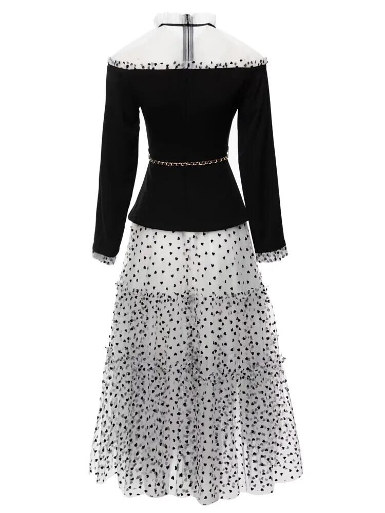 春秋パーティーメッシュブラックプリント長袖シックセクシー女子ミディドレス ロング スプリング 春物 オータム 秋物