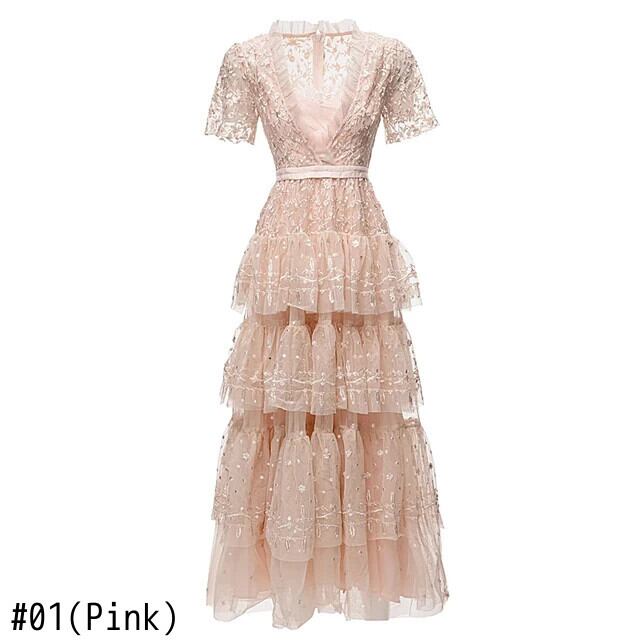 春秋パーティーピンクメッシュ刺繍ケーキセクシーシック甘い女子ロングドレス レッド 大人ガーリー スウィート キュート カジュアル スプリング 春物 オータム 秋物