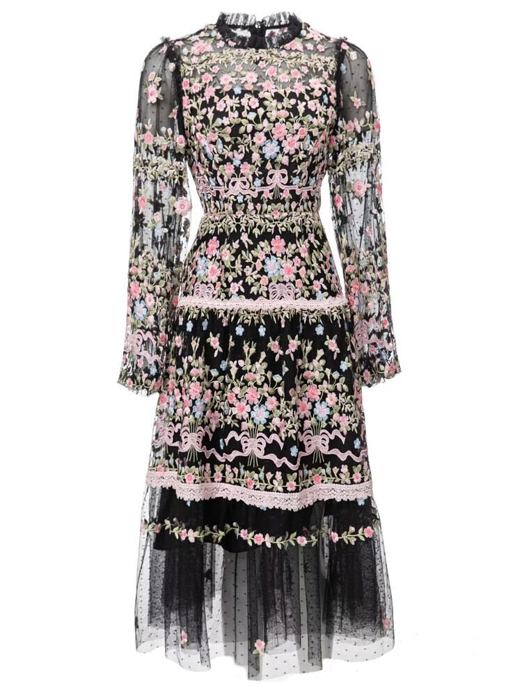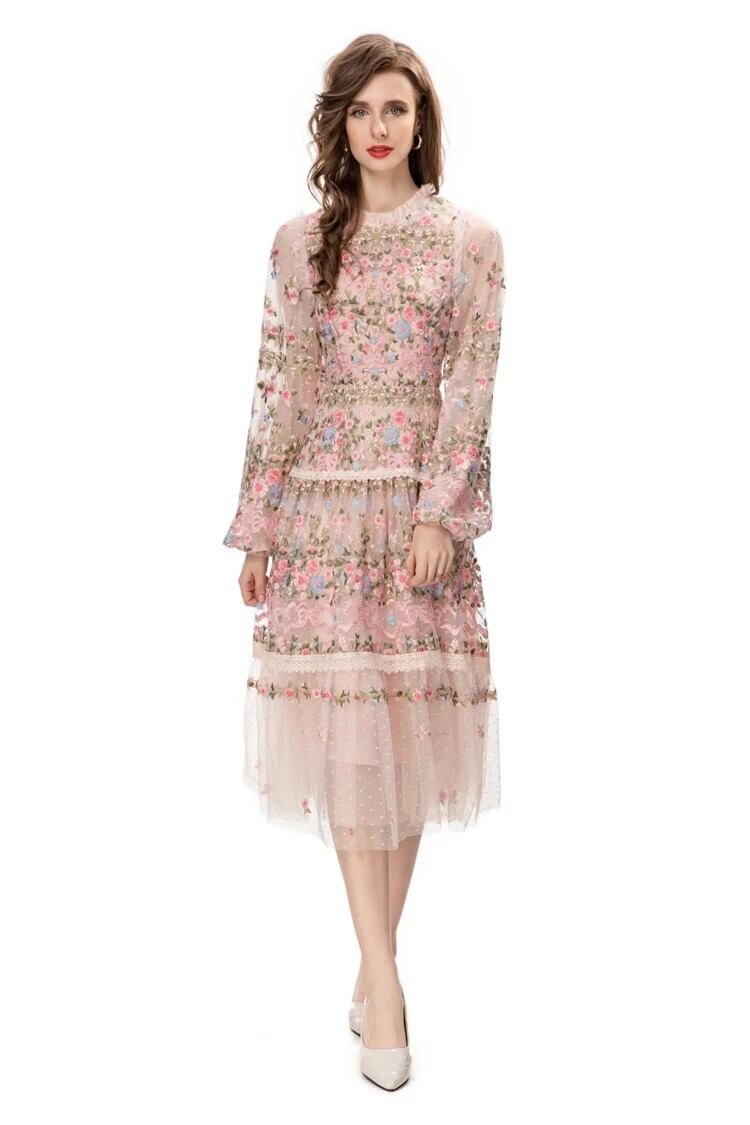 高級秋パーティー刺繍メッシュセクシー甘い休暇ゴージャス紳士長袖ドレス ロング レッド 大人ガーリー スウィート キュート カジュアル オータム 秋物