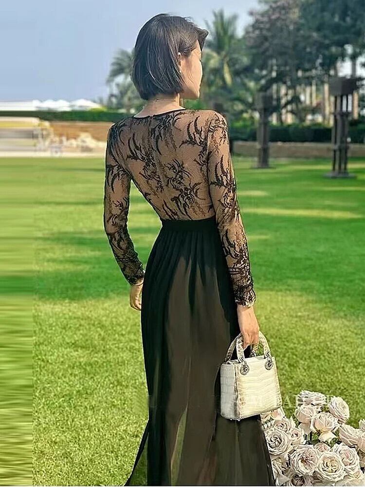 春秋パーティーブラック贅沢セクシービーズ刺繍レースロングドレス レッド スプリング 春物 オータム 秋物
