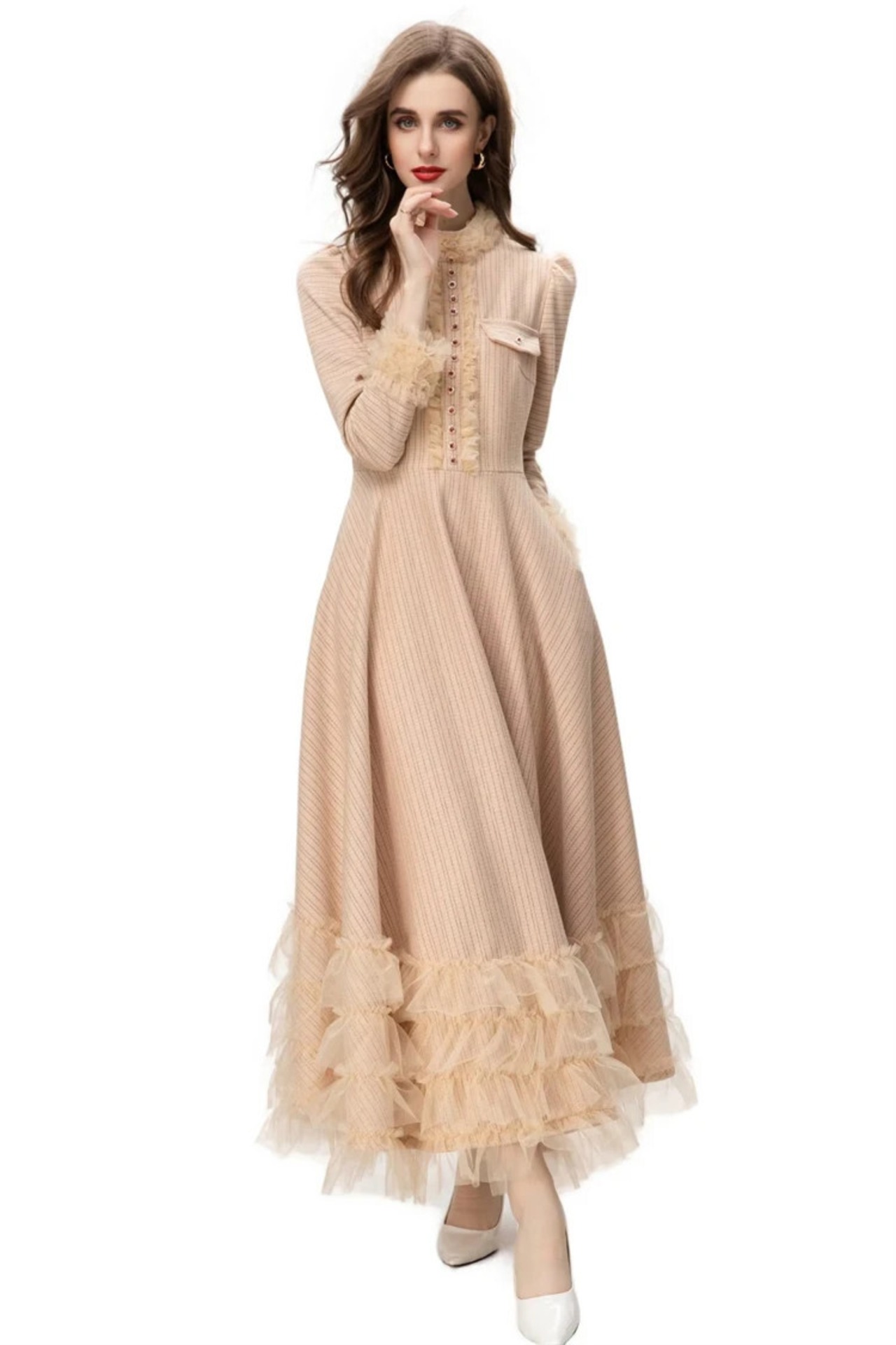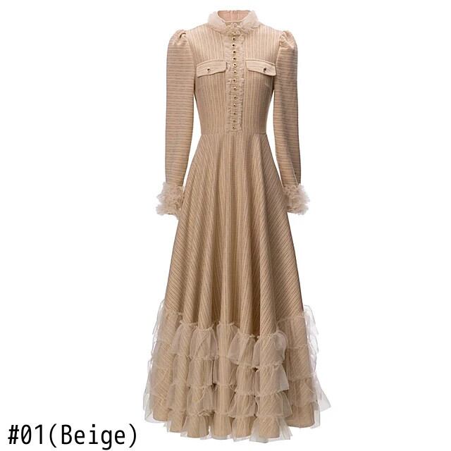 かわいい春秋パーティーメッシュストライプピンクシック女子甘い長袖ドレス ロング 大人ガーリー スウィート キュート カジュアル スプリング 春物 オータム 秋物