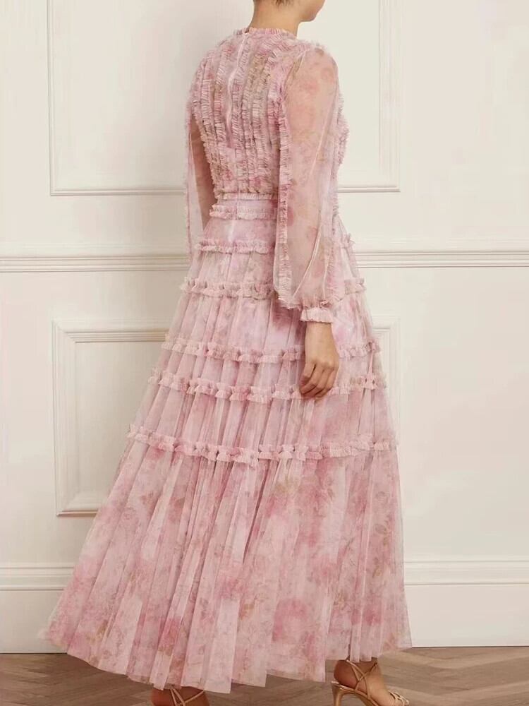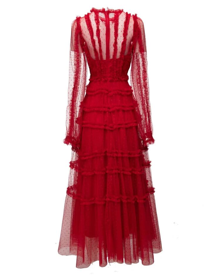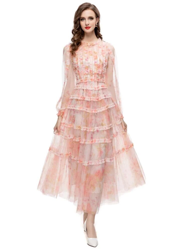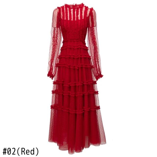 高級滑走路セクシー甘い春パーティーメッシュピンクレッドケーキ誕生日かりロングドレス 大人ガーリー スウィート キュート カジュアル スプリング 春物