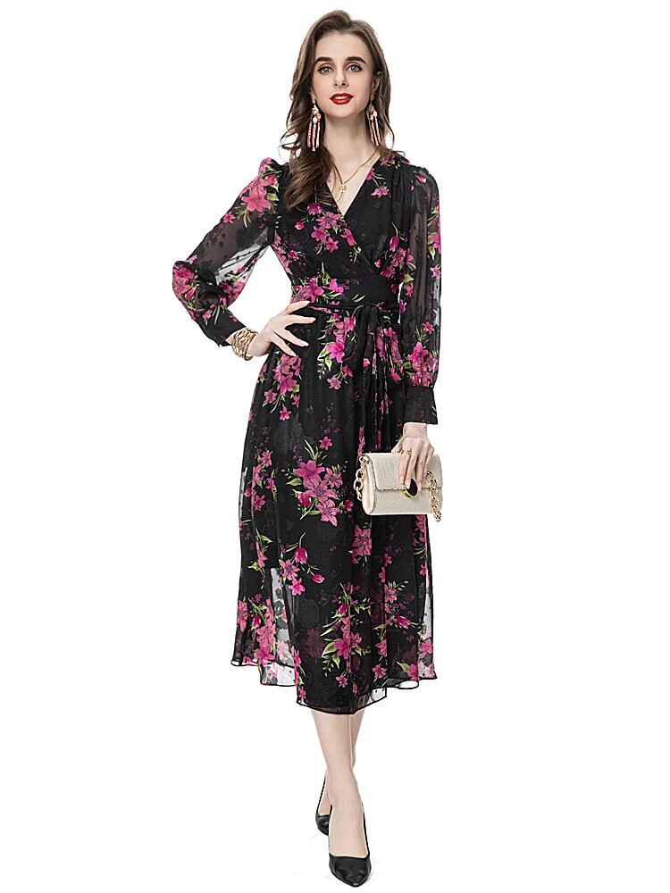 滑走路春パーティー黒プリント ランタン スリーブ セクシー V ネック贅沢かりロング ドレス ブラック ランタンスリーブ スプリング 春物 Vネック